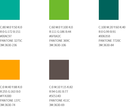컬러 시스템 - 전용컬러1(C:80 M:0 Y:50 K:0/R:0 G:172 B:151/#00AC97/PANTONE 3275C/3M:3630-236) - 전용컬러2(C:60 M:0 Y:100 K:0/R:111 G:186 B:44/#6FBA2C/PANTONE 369C/3M:3630-106) - 전용컬러3(C:100 M:20 Y:60 K:40/R:0 G:99 B:91/#00635B/PANTONE 7720C/3M:3630-84) - 전용컬러4(C:0 M:40 Y:88 K:0/R:255 G:163 B:0/#FFA300/PANTONE 137C/3M:3630-74) - 전용컬러5(C:0 M:10 Y:15 K:82/R:94 G:81 B:77/#5E514D/PANTONE 411C/3M:3630-69)